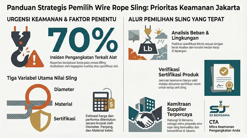 SJ Bersama adalah Supplier wire rope sling Jakarta terpercaya yang menyediakan solusi tali kawat baja berkualitas untuk berbagai kebutuhan industri. Kami menawarkan pilihan produk lengkap dengan kekuatan dan keamanan terjamin. Pelajari cara memilih wire rope sling yang tepat, perkiraan harga pasar, serta mengapa SJ Bersama adalah mitra terbaik Anda untuk pengangkatan yang aman.